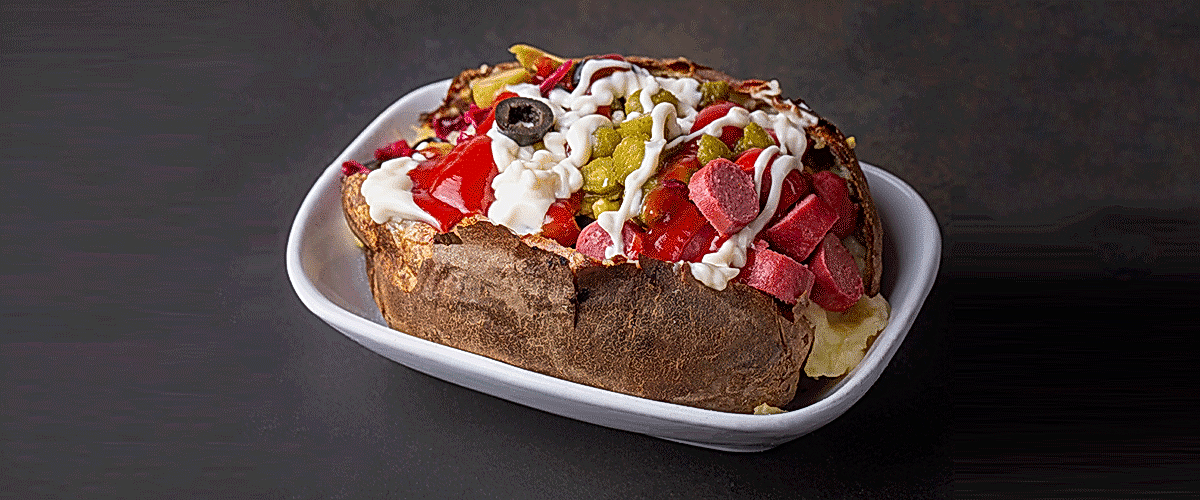 | Dağ Kekikli Tavuk Kumpir (Tereyağı, kaşar peyniri, jülyen tavuk fileto, mantar, kapya biberi, yeşilbiber, dağ kekiği, krema) | |
